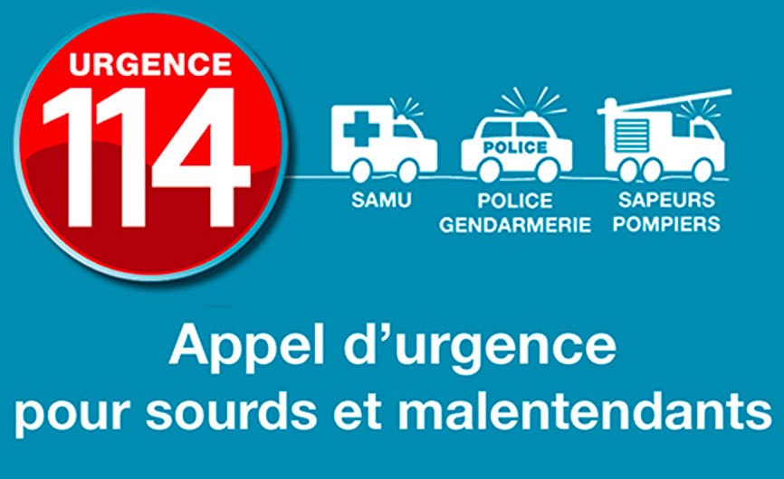 Sourds/Malentendats – 114 Numéro unique, national, gratuit est accessible par visiophonie, tchat, SMS ou fax, 24H/24, 7J/7.